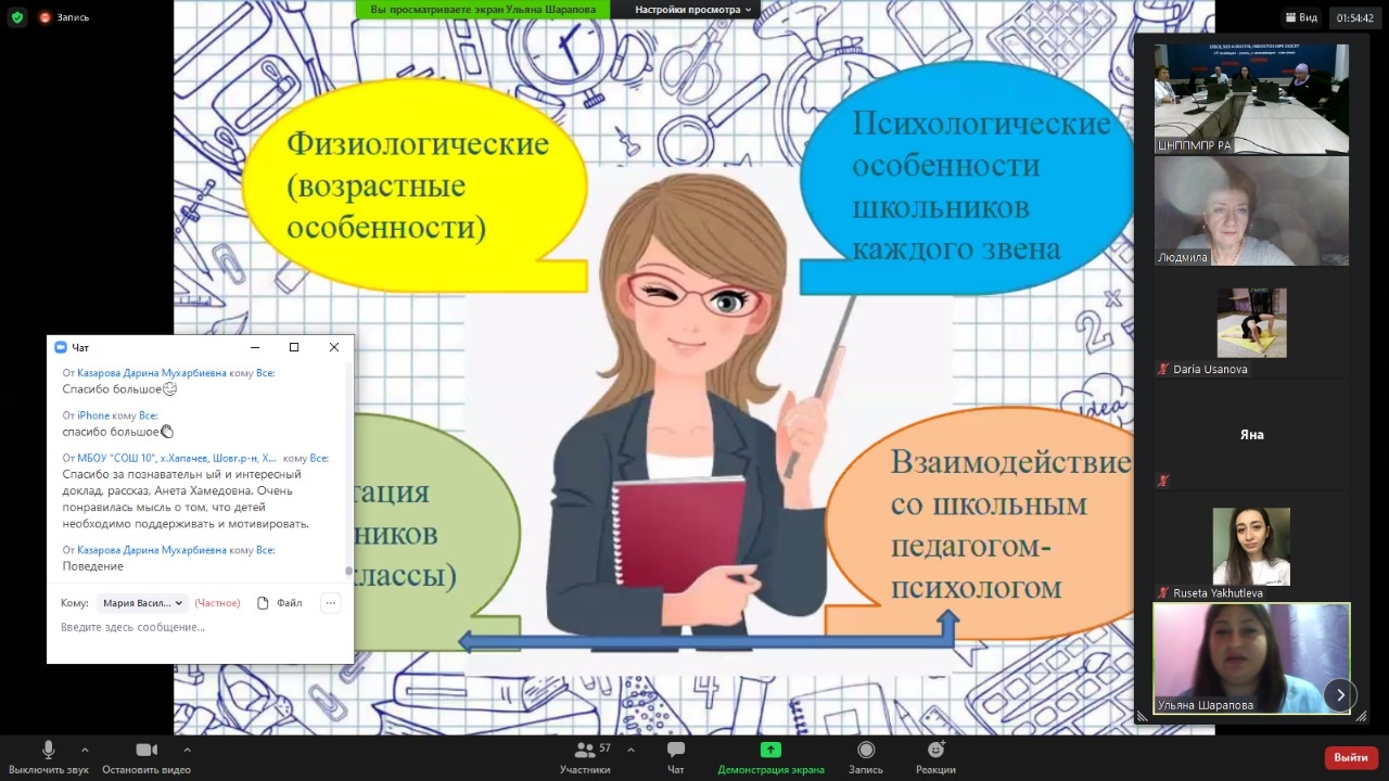 Шарапова У. Е., директор МБУ «Центр психологопедагогической, медицинской и социальной помощи» рассказала молодым специалистам о системе работы с коллективом обучающихся на различных уровнях образования. ⠀ Литвинова А. Х., заместитель директора по ВР, учитель русского языка и литературы МБОУ «Лицей №8» г. Майкопа увлекательно и эмоционально представила свой опыт по проведению внеклассных мероприятий.